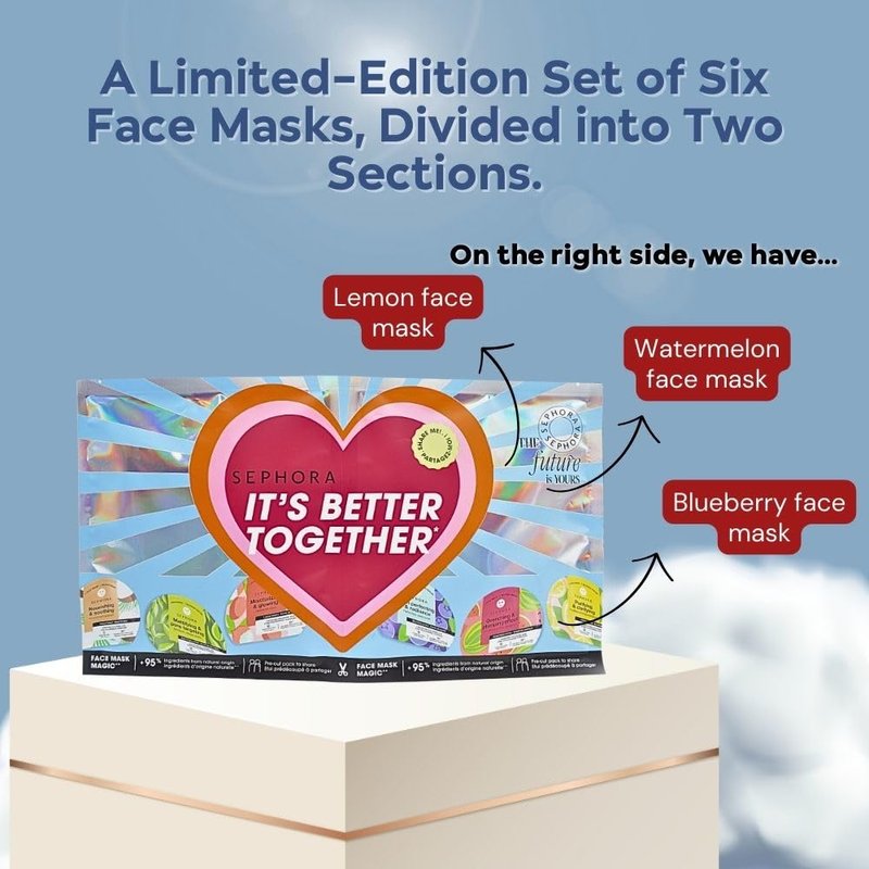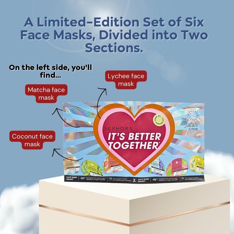 Indulge in radiant skincare this holiday season with SEPHORA COLLECTION Face Mask Magic, a limited-edition set of six masks infused with super-ingredients and captivating fragrances. Perfect for sharing the joy of self-care, this set includes Coconut, Matcha, Lychee, Blueberry, Watermelon, and Lemon masks.