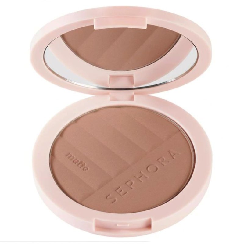 Sephora Collection Matte Bronzer Compact Powder - 00 Sun-Kissed Haze (fair light bronze) - 0.28 oz / 8 g. What it is: A bronzing compact powder that has a hybrid creamy, silky texture that melts into the skin for a natural sun-kissed result. What Else You Need to Know: This multitasking bronzer also helps to smooth and soften the appearance of skin for a flawless complexion all day long. This fine and weightless formula prevents a powdery effect or harsh lines while warming the complexion. The silky-like pressed powder blends effortlessly into skin for a flawless effect. It can be used for all-over bronzing or targeted contouring, with buildable coverage. It is a formula that withstands heat and humidity. There is a mirror built into the case for quick touch-ups.