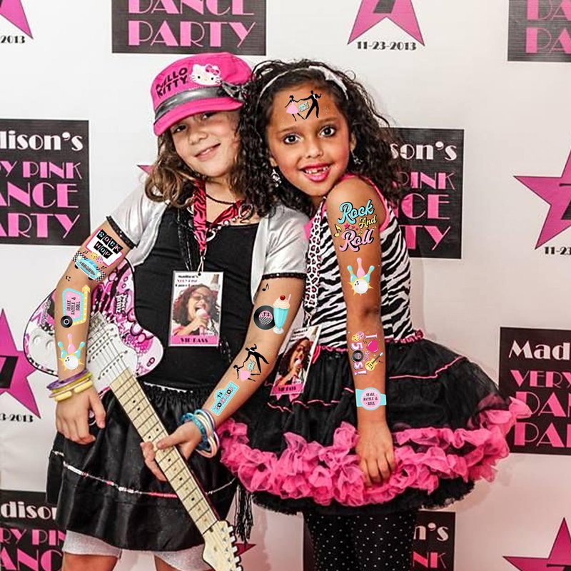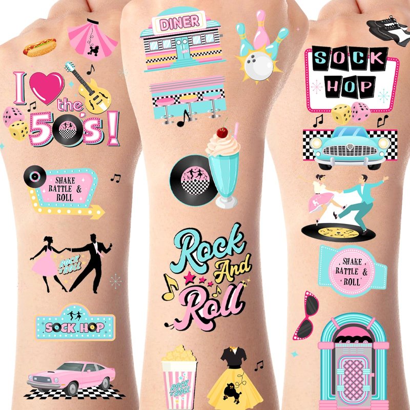 Serencatcher 144pcs 50's Theme Party Decorations Sock Hop Tattoos, 1950s Shake Rattle Rock and Roll Temporary Tattoos Stickers for Retro Props 50s Sock Hop Party Favors Theme Adult Birthday Party