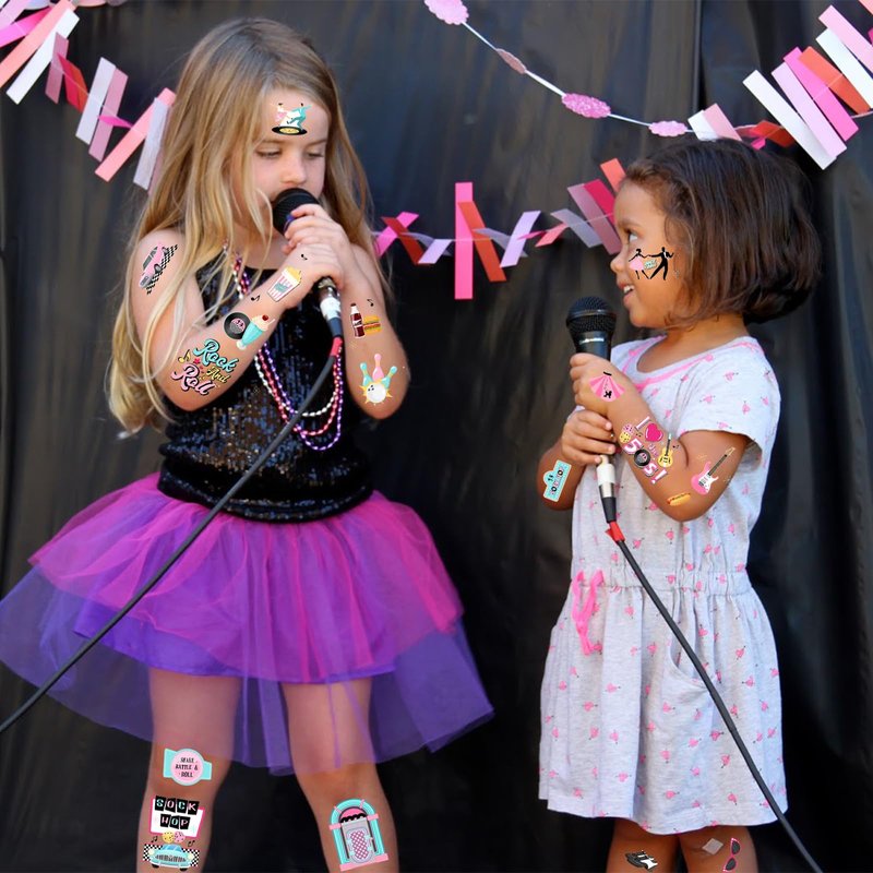 - Unique Design: 50s sock hop temporary tattoos applied many popular 50s element, such as electric guitar, cocktail, dice, bowling, diner, and so on. And we also use pink, teal and black color, all patterns looks exquisite and sense of the age. Kid and adults will love it very much