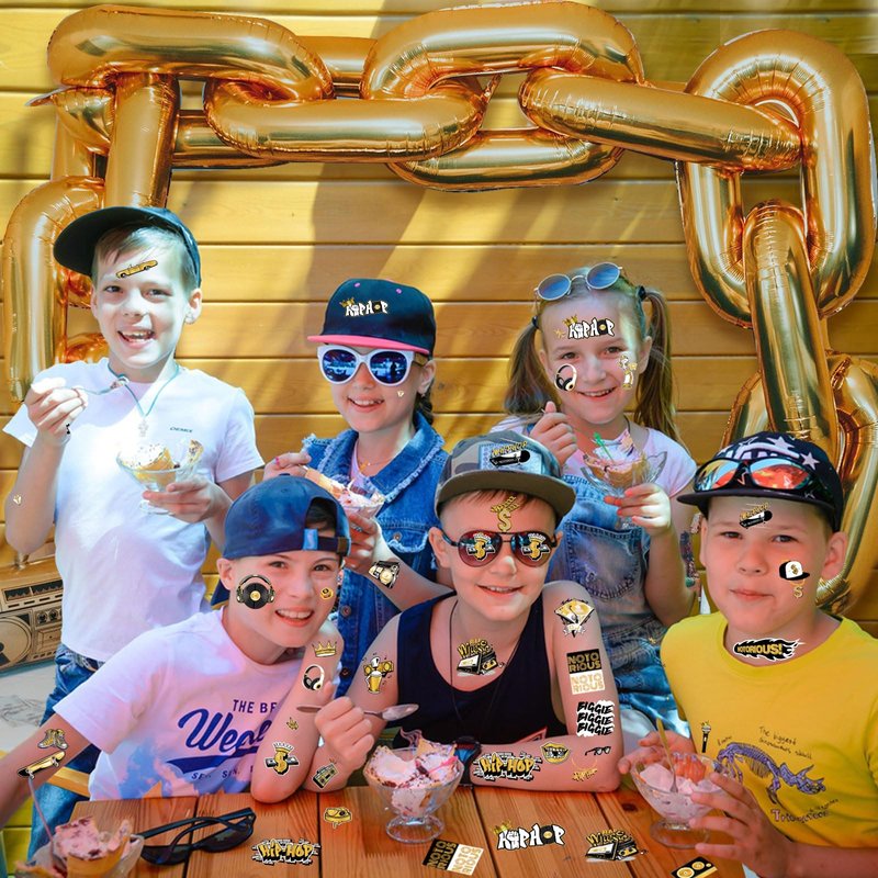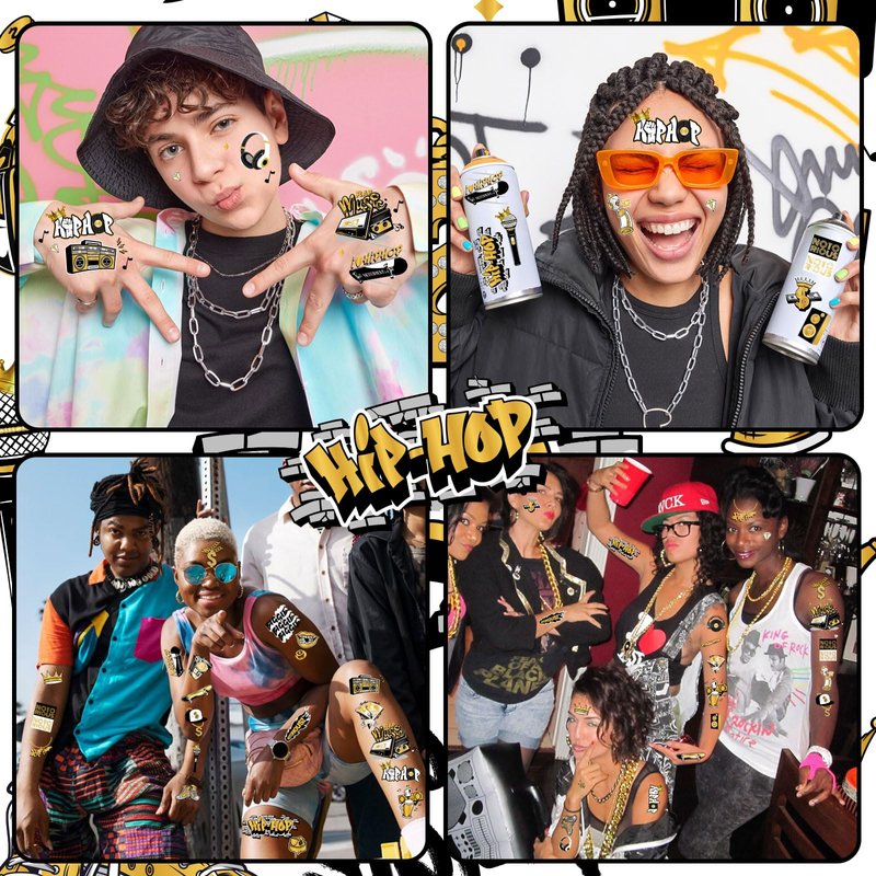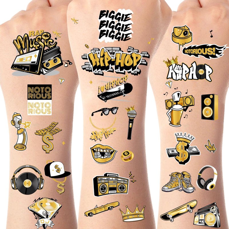 - Hip Hop Temporary Tattoos: The notorious party favors include 12 sheet tattoos in 2 styles, one is with letter”Hip-Hop”, another is with letter”RAP music”. All sheets have around 144pcs tattoos, which is enough quantity for your hip hop party use or gift giving, please don’t miss this great 80s 90s party favors