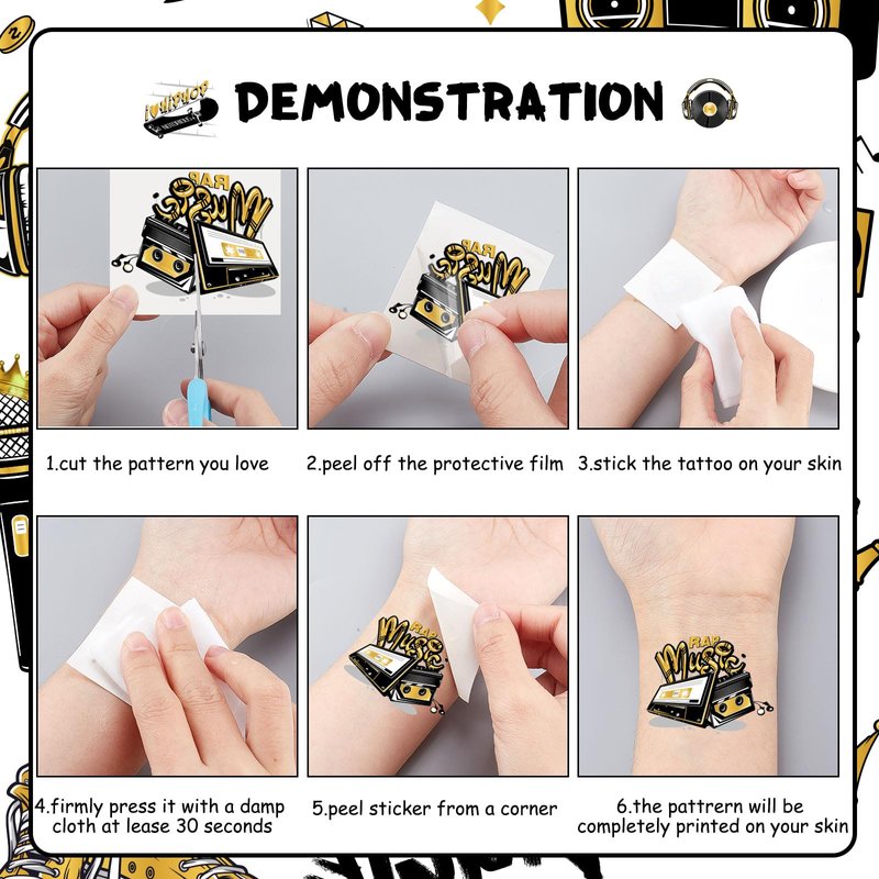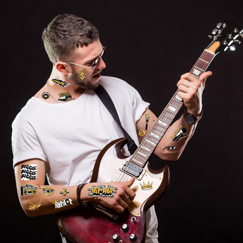 - Unique Design: Hip hop temporary tattoos applied many popular notorious element, such as sound recorder, gramophone, skateboard, sunglasses, microphone, gold ring and chain. And we also use gold and black color, all patterns looks exquisite and sense of the hip hop. Kid and adults will love it very much
