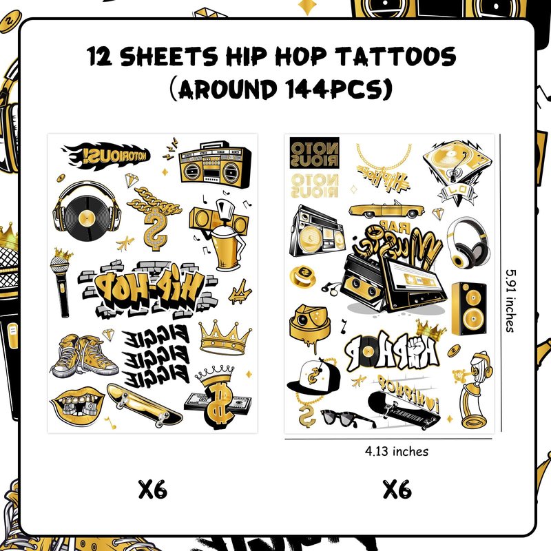 Package list:12sheet(144pcs) x Hip Hop Temporary Tattoos(5.91inches x 4.13inches)