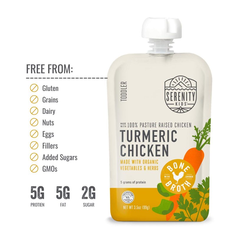 Our delicious Turmeric Chicken is made with organic free range chicken bone broth, pasture raised chicken from small American regenerative family farms, organic vegetables, and earthy organic herbs like turmeric and ginger. These savory, whole food toddler purees are a natural source of vitamins, antioxidants, and minerals, that helps your growing little one learn to enjoy complex flavors and sets them up for healthier eating. Why bone broth? Bone broth is rich in easily digestible protein and amino acids. With the addition of herbs, our Turmeric Chicken can help broaden a toddler’s palate, strengthen growing bones and teeth, help build connective tissue and joints, reduce the risk of food sensitivity, and support immunity and digestion. With no added sugars or preservatives, our allergen-free, easy grab and go pouch is the most nutritious no sugar added toddler food option for your little one. Make your kid a Serenity Kid!