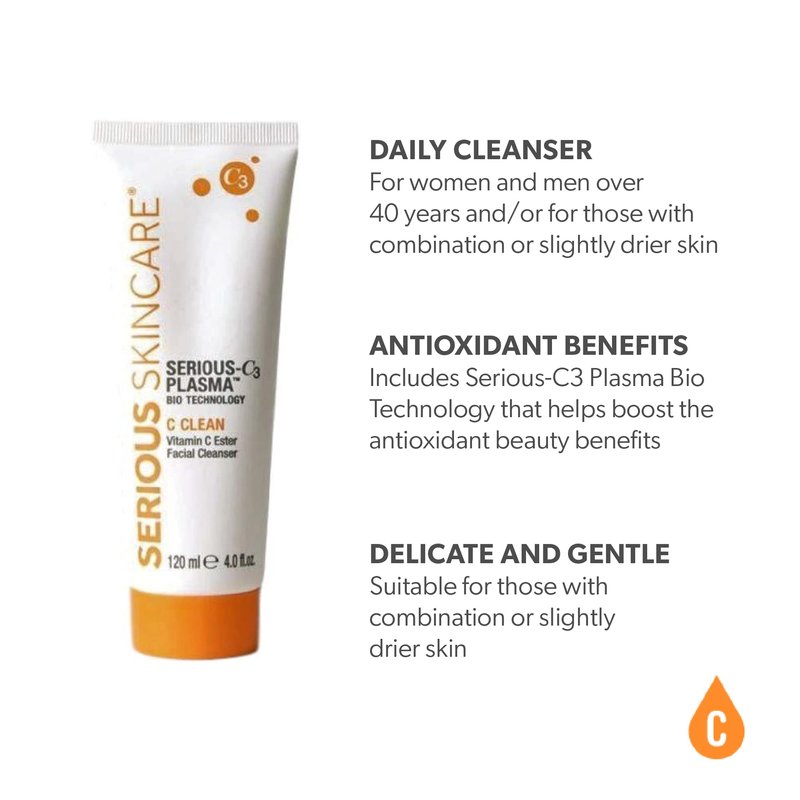 Serious Skincare’s C3 Plasma Vitamin C Ester Cleanser is a delicate facial cleanser that gently bathes the skin with fresh Vitamin C, botanicals and fabulous Vitamin C Esters to hydrate and clarify the skin. Ideal for mature, dry and combination skin types. Our gentle, creamy consistency effortlessly cleanses the skin of make-up, oil, dirt and debris as it combines the age-fighting beauty benefits of Serious-C3 Vitamin C Esters, Aloe Leaf Juice, botanical extracts and other antioxidants to balance your complexion. C Clean leaves the face with a boost of hydration and a clean, fresh feel for both morning and night use.