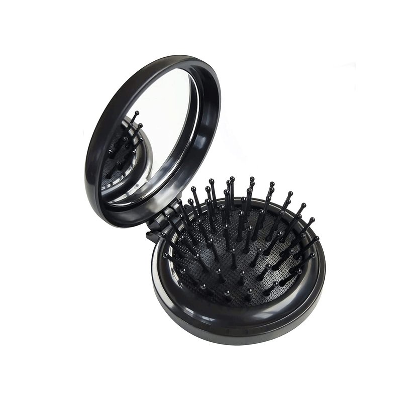 Serrale Folding Hair Brush Mini Round Comb with Mirror Portable Travel HairBrush Pocket Compact Massage Combor for Women & Girls Small Purse, Gym, Trip, School Camping(Black), 2.5x7.5x6.5cm