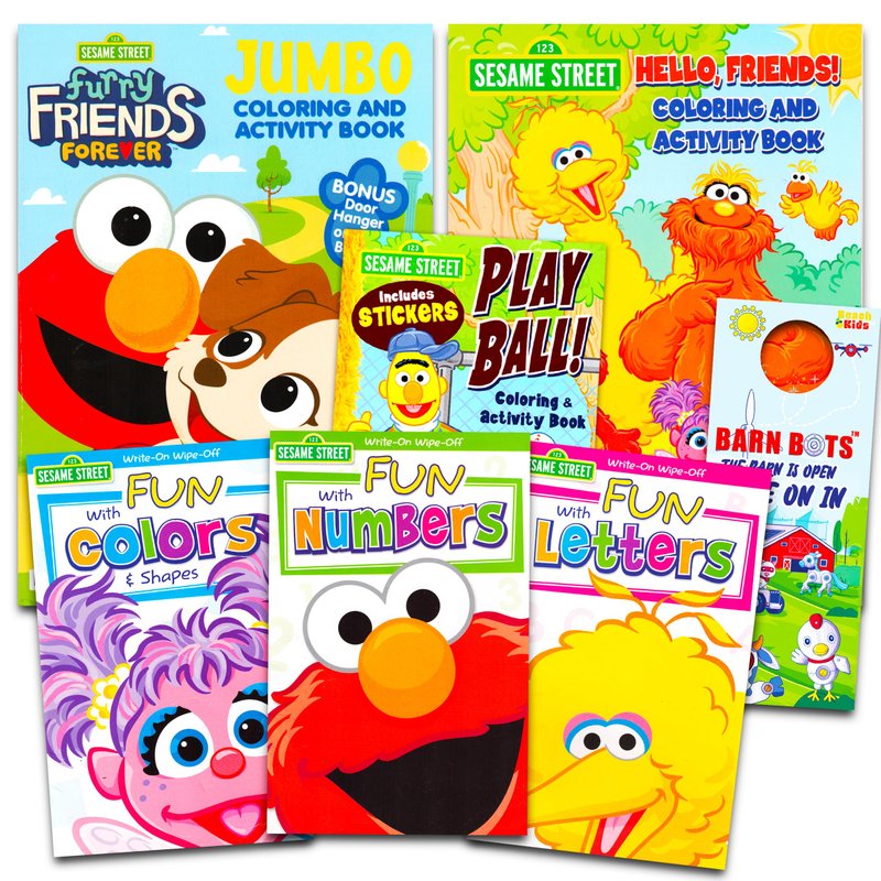 - Over 280 coloring pages total. Great for your Sesame Street and Elmo enthusiast! This coloring and activity book set will provide many hours of learning and fun! Includes Barn Bots door hanger.
