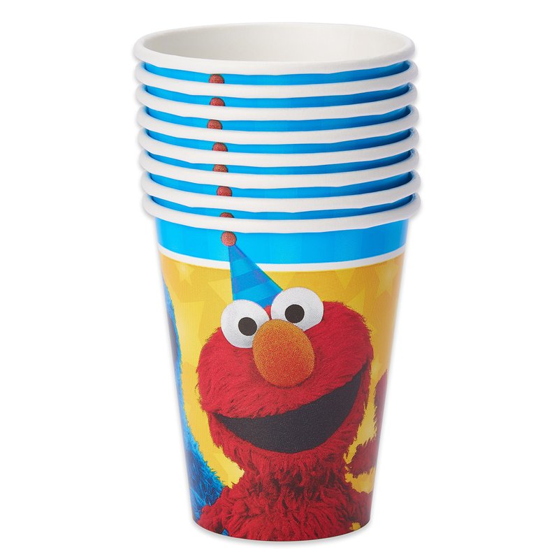 - Paper party cups feature Sesame Street characters Cookie Monster and Elmo in a bright and fun wraparound design