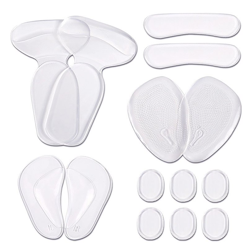 - Material: silicone; Package: 1 pair type T heel grips, 1 pair gel heel liners, 1 sheet (6pcs) shoe inserts stickers, 1 pairs forefoot pads and 1 pair arch support insoles