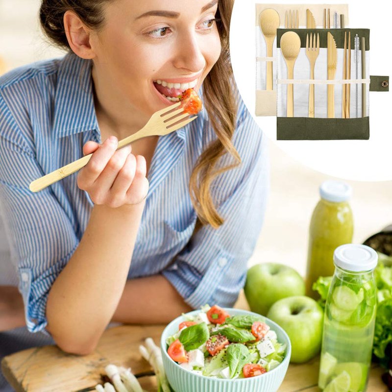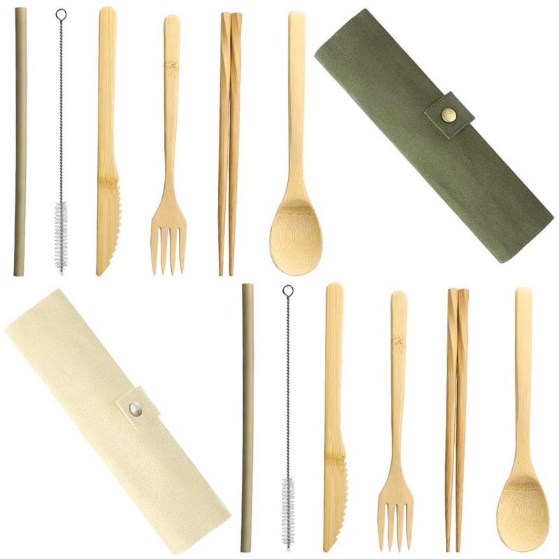 - 7 PCS UTENSILS SET- Each set comes with 1 Bamboo Dinner Fork, 1 Bamboo Tablespoon, 1 Bamboo Knife, 1 Pair Bamboo Chopsticks, 1 Cleaning Brush, 1 Bamboo Straw and 1 Carrying Pouch.