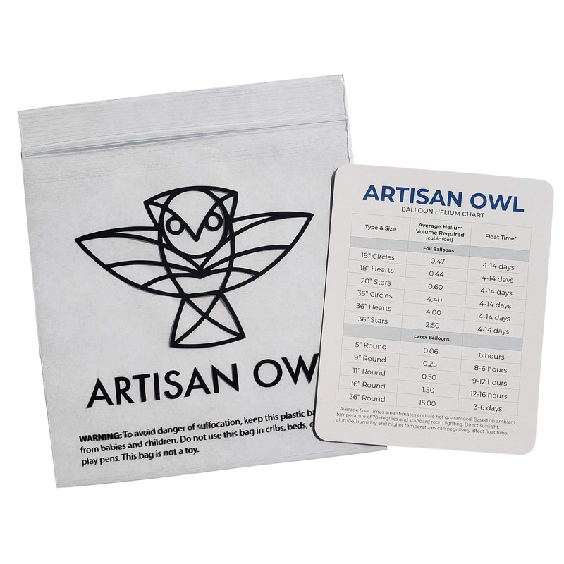 - Every package comes with an Artisan Owl Balloon Helium Chart and is shipped in our trademarked packaging to ensure quality.