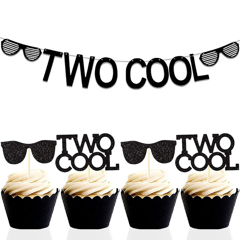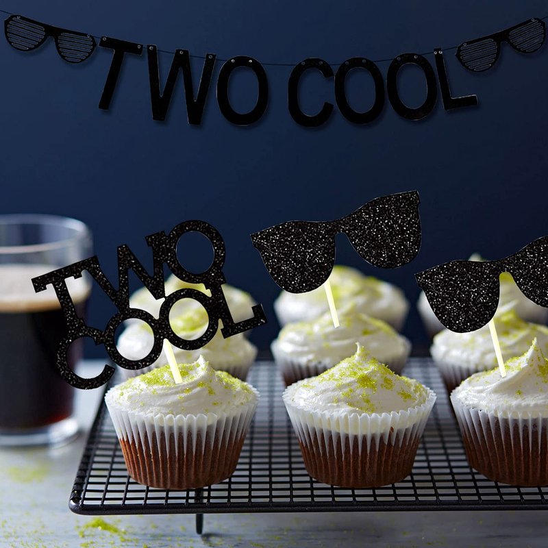 - Two Cool Party Supplies Decoration Include:Banner x1,Two cool cupcake topper X12, Sunglasses cupcake topper x12.