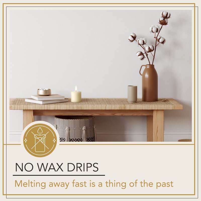 The wax used in this pillar candle is of the Highest Caliber and is made the Europe. It is guaranteed not to drip or melt away fast.
