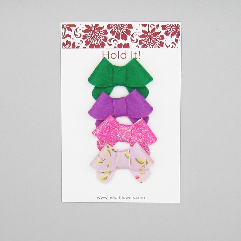 This set measures approximately 2" from top of bow to end of the tail and 1.5" across the bow. Set contains: hot pink glitter, lavender rose, orchid and emerald felt. This set will be on an alligator clip for either left or right side of the head. Clipped will be lined with a coordinating ribbon. *Every attempt is made to accurately display the colors of the felt however, the settings on computer screens can cause the colors to vary.**