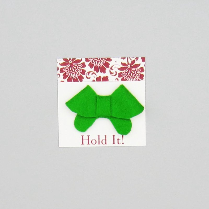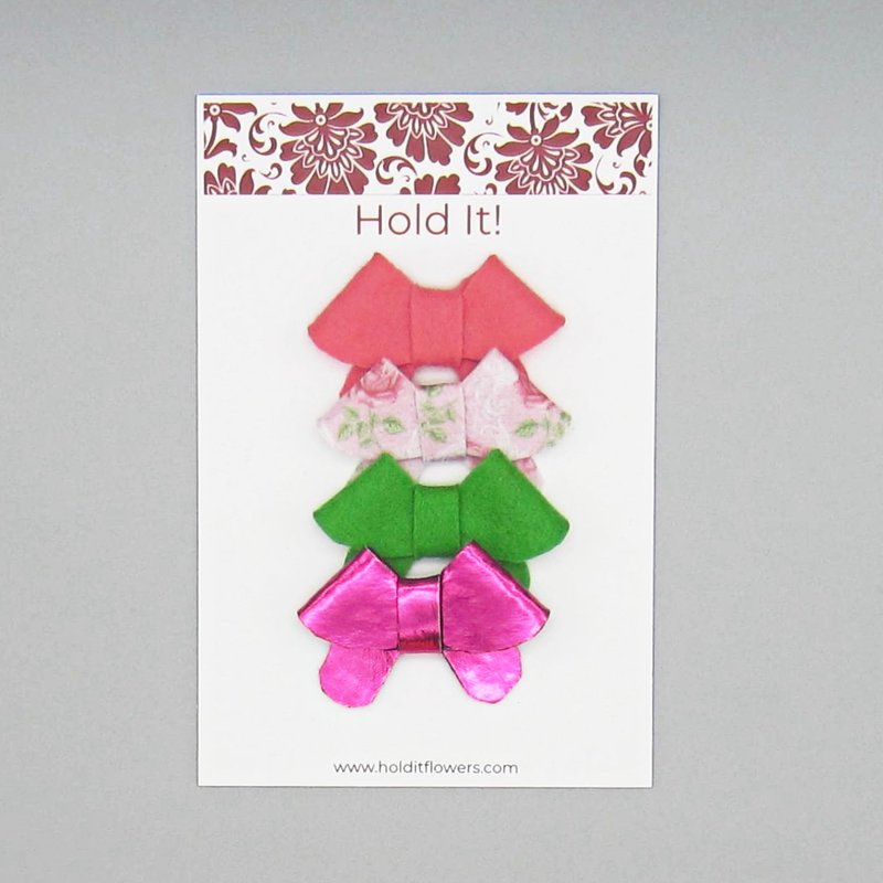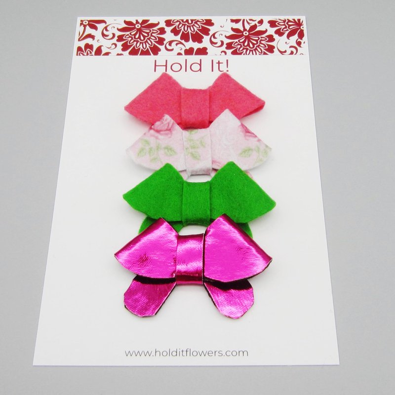This set measures approximately 2" from top of bow to end of the tail and 1.5" across the bow. Set contains: watermelon, sprout, cabbage rose, hot pink metallic felt. This set will be on an alligator clip for either left or right side of the head. Clipped will be lined with a coordinating ribbon. *Every attempt is made to accurately display the colors of the felt however, the settings on computer screens can cause the colors to vary.**