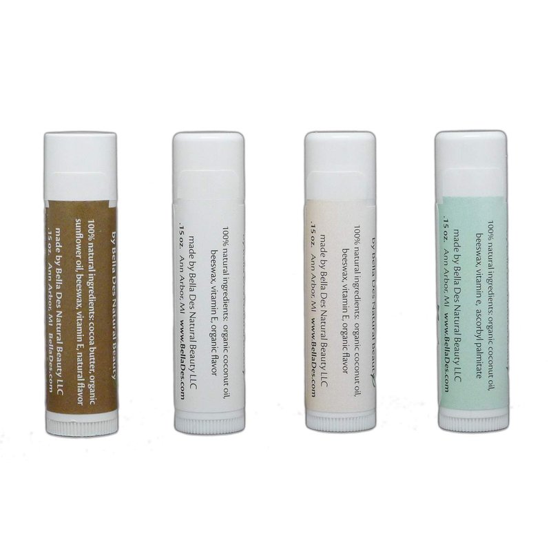A pack of 4 incredibly moisturizing lip balms that help heal dry, chapped, cracked or sore lips. Extremely emollient formulas are soothing and long lasting. All flavors are 100% natural and taste great.br>