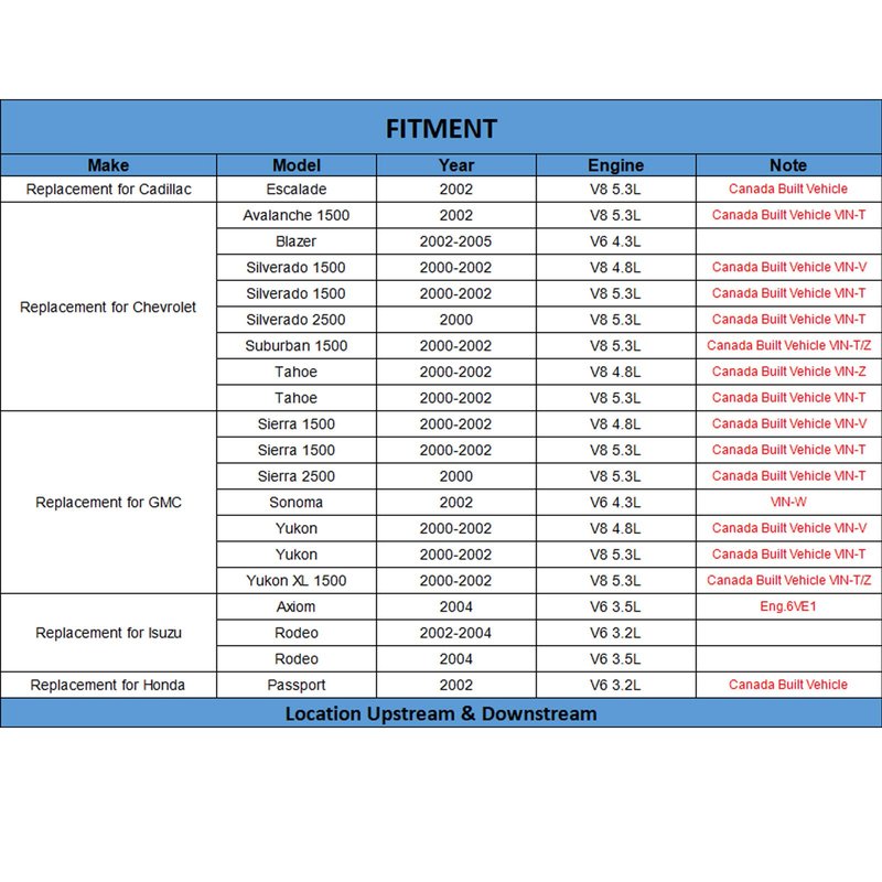 - Replacement for Chevrolet Avalanche 1500 2002 V8 5.3L / Silverado 1500/Tahoe 2000-2002 V8 5.3L / Silverado 2500 2000 V8 5.3L---Canada Built Vehicle VIN-T, Silverado 1500 2000-2002 V8 4.8L (Canada Built Vehicle VIN-V), Suburban 1500 2000-2002 V8 5.3L (Canada Built Vehicle VIN-T/Z), Tahoe 2000-2002 V8 4.8L (Canada Built Vehicle VIN-Z), Blazer 2002-2005 V6 4.3L
