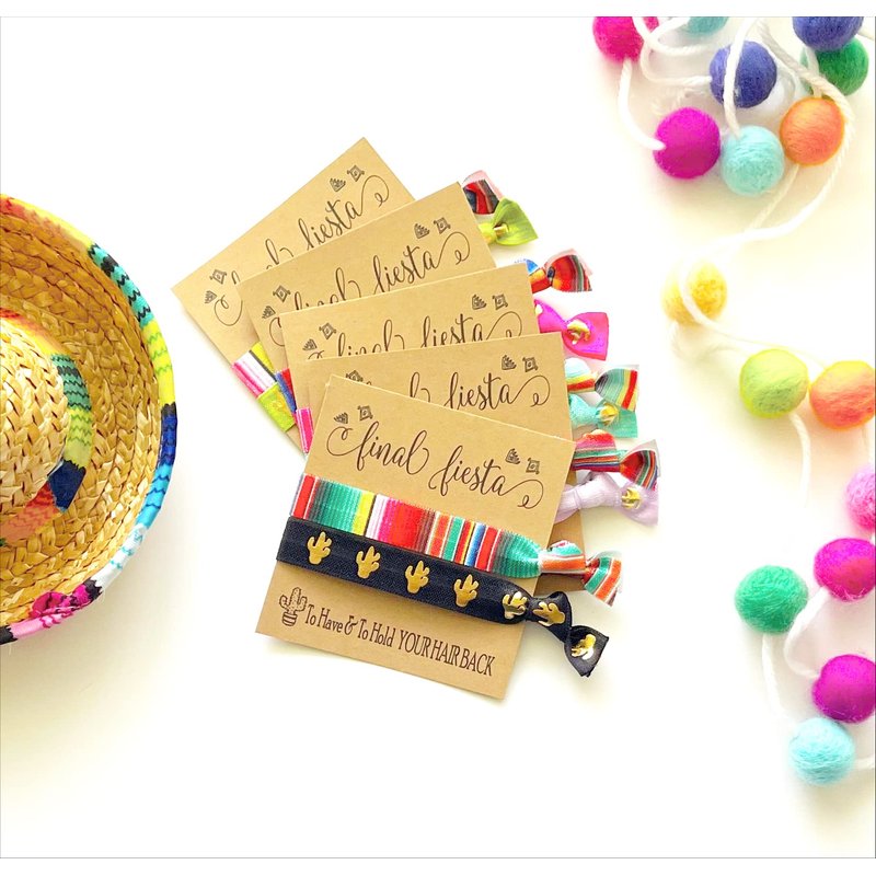 Set of 5 Final Fiesta hair tie favors | 5 Favor cards + 2 hair ties per card in Assorted Serape + Assorted Cactus prints.