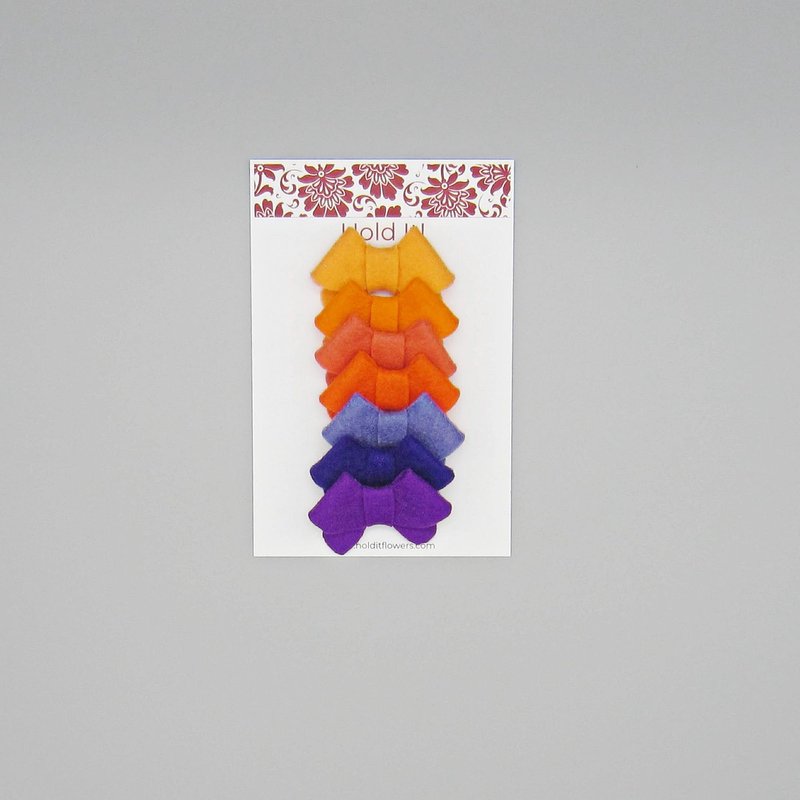 This set measures approximately 2" from top of bow to end of the tail and 1.5" across the bow. Set contains: deep purple, purple, lavender, carrot, melon, orange, and shrimp felt. This set will be on an alligator clip for either left or right side of the head. Clipped will be lined with a coordinating ribbon. *Every attempt is made to accurately display the colors of the felt however, the settings on computer screens can cause the colors to vary.**