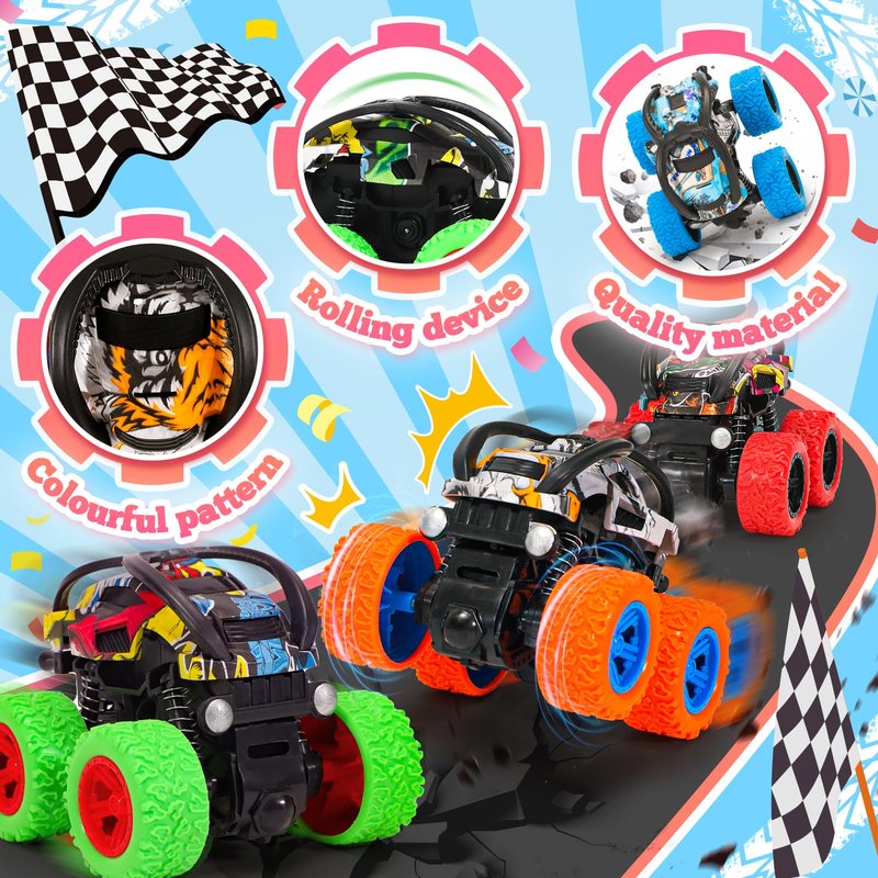 - Push and Go Monster Truck Toys: Experience new toy cars for kids, toy set includes 4 graffiti look double-sided flip cars, amazing stunt flips to attract children's attention, bringing hours of excitement and thrilling adventures