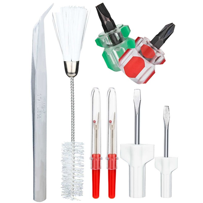- Package Contains: 1 pack tweezer, 1 pack double headed lint brush, 2 pack red seam ripper with plastic handles, 2 pack ultra short screwdrivers (one flat head and one phillips) and 2 pack different size screwdrivers (one small and one large). Ideal for replacing lost or dull original tools in your sewing box, easy to repair and cleaning sewing machines.