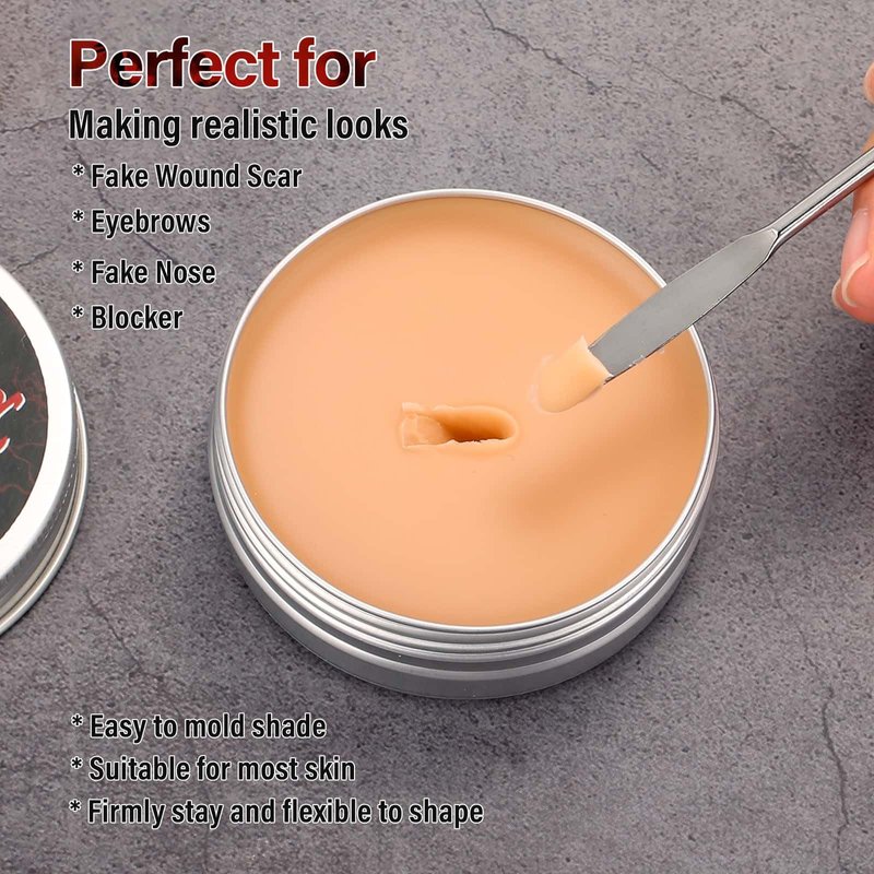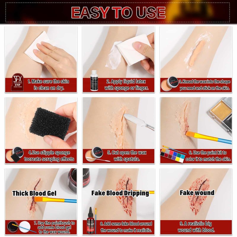 - Realistic Special Effect Makeup - You can use scar wax and liquid latex to create gruesome effects such as fake burns, scars, cuts, bites and more. If the wax is too sticky, you can apply some Olive Oil to make it blend to your skin well. To create 3D effects or textured skin, mix liquid latex with materials such as cotton or tissue before application. Liquid Latex can also be used as a glue adhesive for prosthetics and other appliances