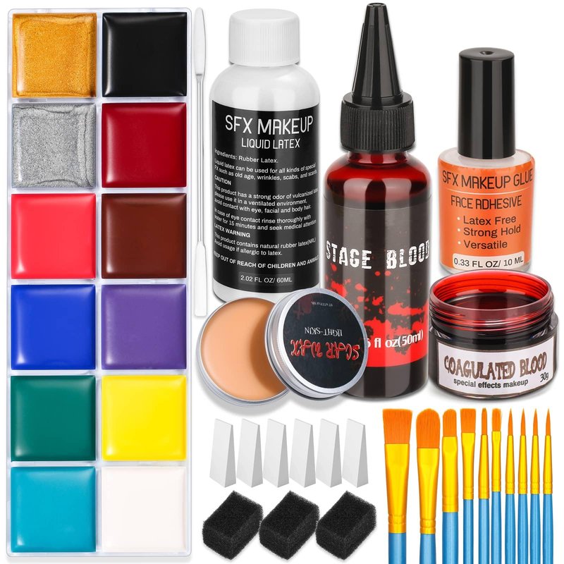 - Completed SFX Makeup Kit - Package comes with 12 colors of face paint, scar wax, liquid latex, face makeup glue, fake blood, metal spatula, brushes of different sizes, black SFX sponge, makeup sponge, and instruction. This special effects makeup kit is lead-free, hypoallergenic, and passed the test according to the Hygienic standard for cosmetics, suitable for women and men to use and achieve stunning results