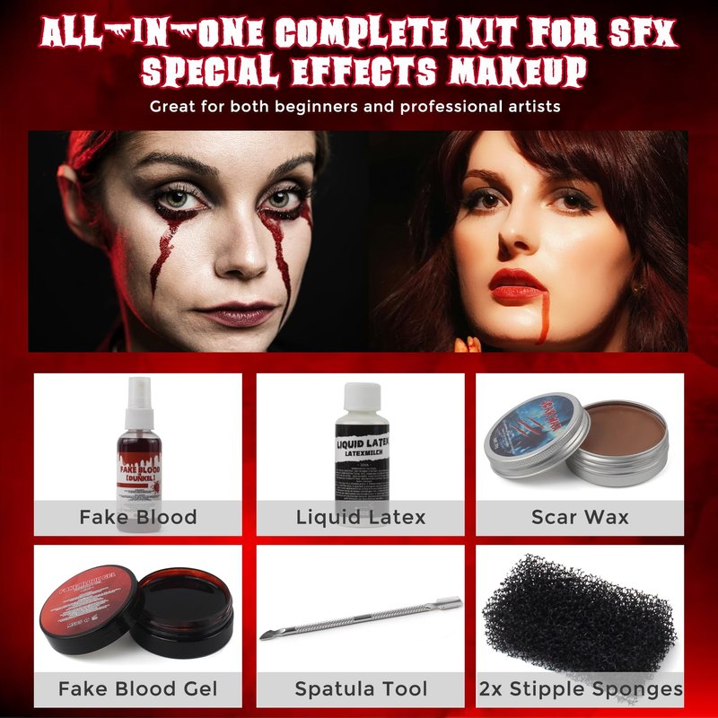- Complete Kit for SFX Special Effects Makeup: Our bruise makeup kit includes everything you need to create a realistic and natural scary looks you want. A kit contains 1 Pc Fake Blood (1.69 Fl Oz.), 1 Pc Liquid Latex (1.01 Fl Oz.) ,1 Pc Scar Wax (1.06 Oz.), 1 Pc Coagulated Fake Blood Gel (1.76 Oz.), 1 Pc double ended Spatula Tool and 2pcs Black Stipple Sponges for application of the blood. It is great to use as fake blood makeup, cuts or wounds on face/body. Get ready to your gruesome makeup