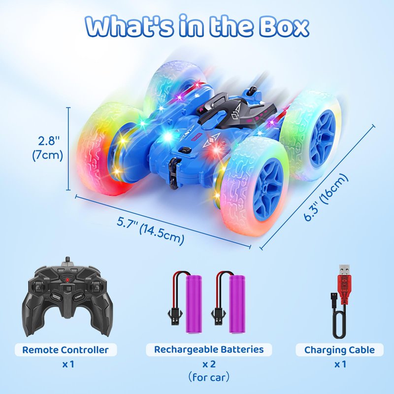 - Fancy Stunts: The RC stunt car can move in all directions and perform many cool stunts, especially can do 360° spins and 180° flips on both sides. It is also equipped with 2 powerful motor systems to play in multi-terrains.
