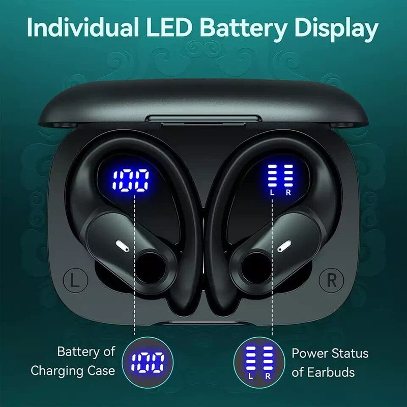 Dual LED Digital Display & 36 hours Playtime: Wireless earbuds with dual power display show the remaining battery of charging case by the number on the screen, and the charging status of ear buds by up and down of LED bar, which will fade when headphones are fully charged. bluetooth headphones with 650mAh charging case have up to 36hrs of listening time with 5 additional charges (6hrs in buds/30hrs in case), you can get the extra electricity it takes to keep your music going. Wireless Charging & USB Type-C Charge: Bluetooth earbuds support wireless charging and Type-C charge. One is just putting the case on the wireless charging pad (not included) with the LED display facing up. Besides, wireless earbuds with earhooks come equipped with Type-C cable to charge the case. Both convenient charging methods improve battery life of wireless headphones to 1 hour on 15mins charge. The number of battery display on the left flashes when the charging case is being charged. One Button Control: The multi-function button on each earphone can manage audio play or calls effortlessly. Skip songs, launch music and answer calls simply by tapping your earbuds wireless bluetooth, so you don't need your device to adjust the music. Automatically power on and connect to your device when simply removing the headphones wireless bluetooth from the case, for a quick and easy operation. With earbuds seated in the case, wireless earphones shut down and recharge. High-fidelity Audio & Crystal-clear Call: Bluetooth headsets adopt 11mm drivers and volume-optimized active EQ keep audio clear and balanced at any volume, and the high compliance diaphragm reproduce a rich bass range, also enhances sound quality and reduces distortion. Design for Sports & IPX7 Sweat-resistant: Wireless earbuds bluetooth with microphone are designed with soft, flexible, and secure-fit earhooks aimed at fully fitting your ears