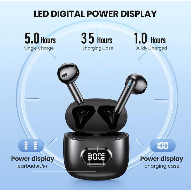 - Dual LED display and 1 hour quick charge for excellent battery life: The Wireless Headset Bluetooth has a dual digital power display that shows the remaining power in the left/right Wireless Bluetooth earbud and charging compartment when the case is opened or closed. One charge lasts up to 5 hours and 7 more charges from the charging compartment extend listening time up to 40 hours.