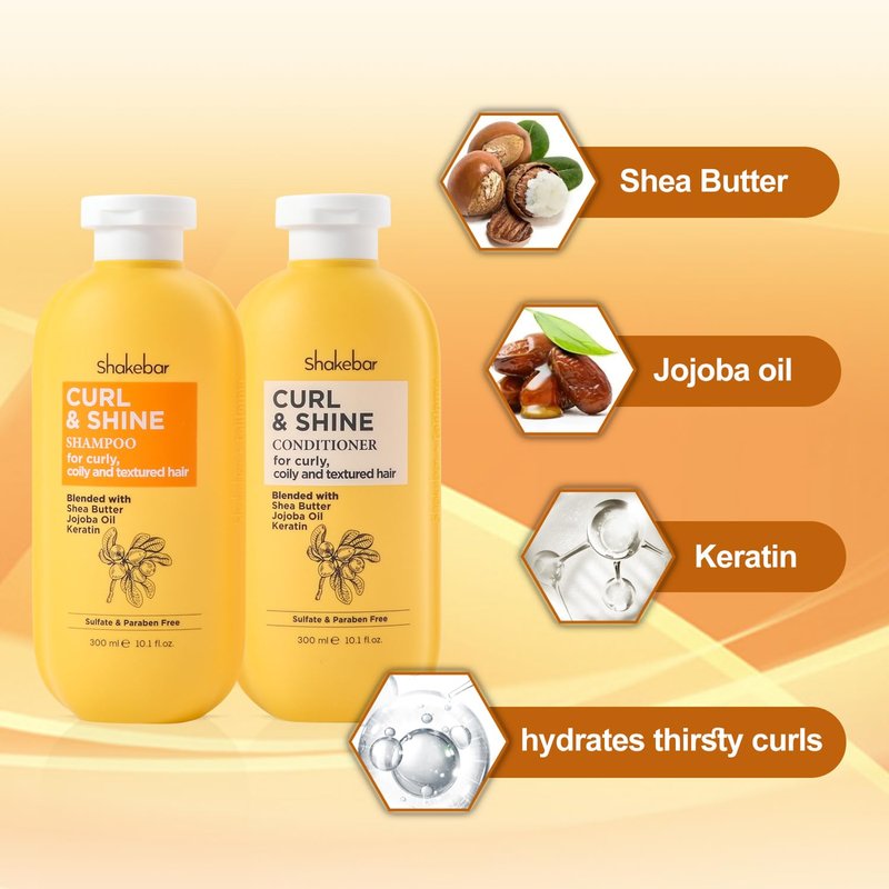 SHAKEBAR Keratin Curly Hair Shampoo and Conditioner Set, Curl & Shine Natural Shampoo Rich Shea Butter, Jojoba Oil, Keratin, Sulfate Free, Paraben Free, Frizz Control, Moisturize Dry Hair