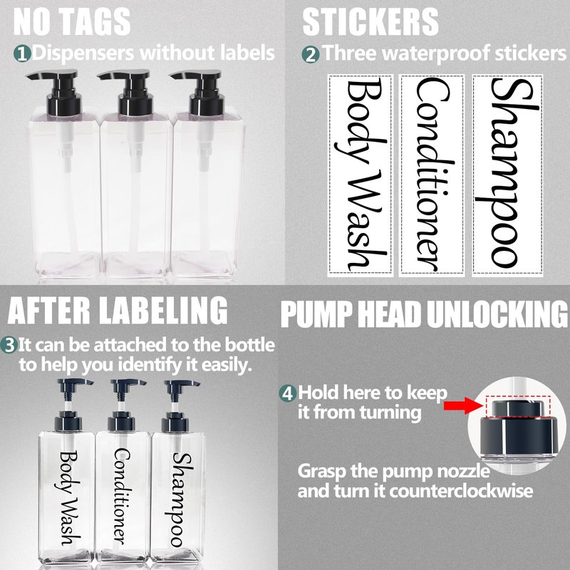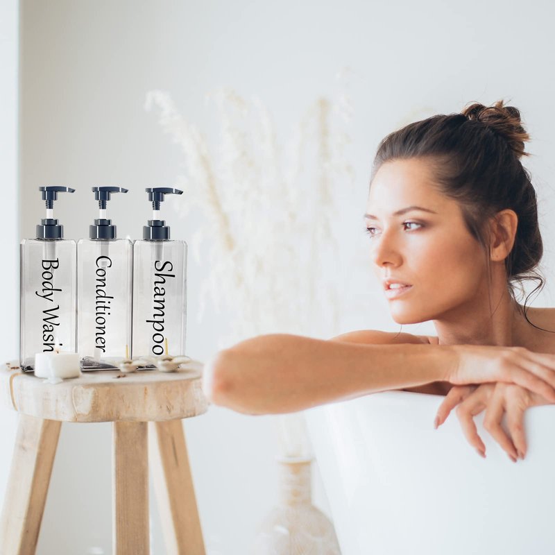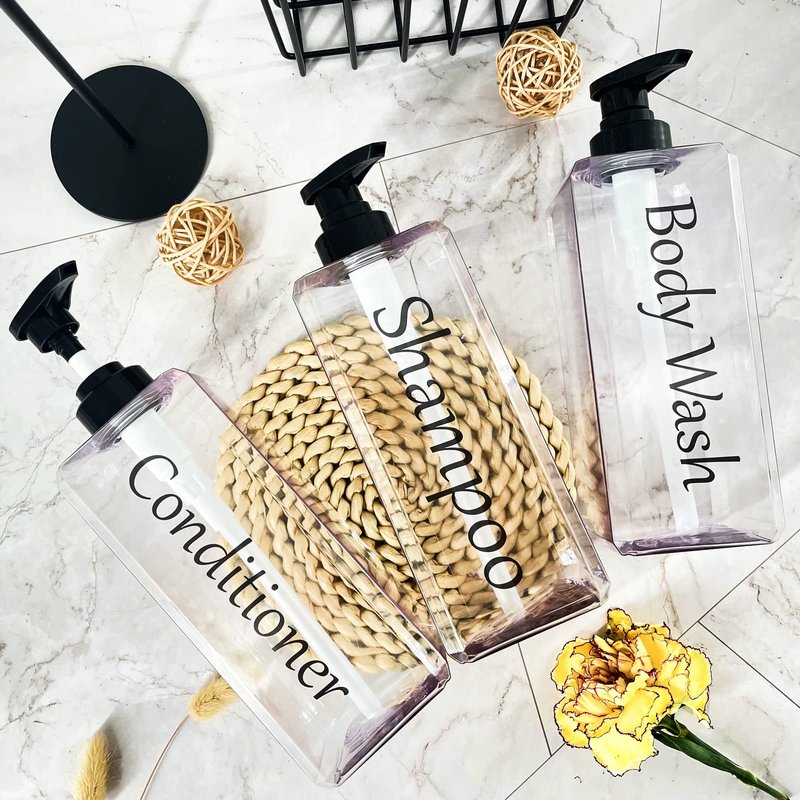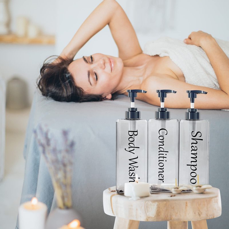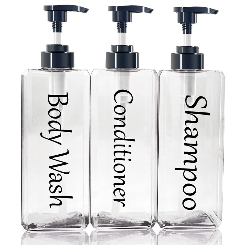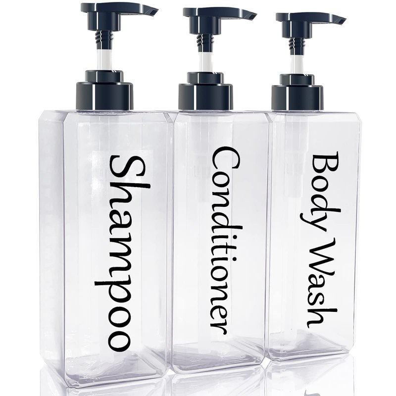 - 【Large capacity】:Set of 3, shampoo conditioner body wash dispenser each individual bottle bottom: 2.95 x 2.95 inches; height: 9.4 inches. (Holds 27 oz. approx. 800 ml) Large capacity to meet the daily essential needs of the whole family. Note - We also include 3 decorative labels (shampoo, conditioner, body wash) in the package that you can put on the bottles yourself to help you easily identify them.