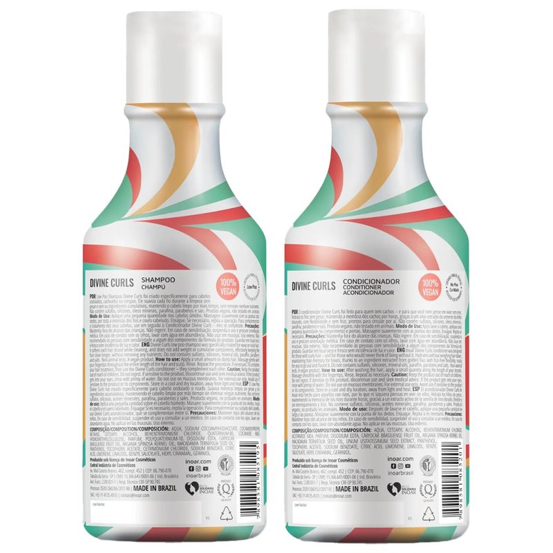 Inoar was created to bring beauty to the world, at affordable prices. Our team at Inoar focuses on quality and safety while making sure we can ship the best vegan hair products in the market to our amazing customers worldwide. Divine Curls is a line of products that have been specially formulated for curly hair. These products clean, hydrate, and keep curls flexible without weighing it down. It maintains curl memory for hours, helping to keep your curls in place for hours. This shampoo & conditioner set cleans and moisturizes your hair without weighing it down. This formula maintains the effectiveness of the cleansing, without removing nutrients from the hair. Enriched with golden flaxseed, which helps make your hair flexible and frizz-free. All our products undergo testing, but never on animals. We do not use ingredients of animal origin and ask our suppliers not to test on animals. Inoar also prioritizes the sustainable use of water and energy, ensuring proper treatment of industrial waste. Wash your hair with Divine Curls Shampoo, gently massaging into the scalp, rinse and repeat if necessary. Before applying Divine Curls Conditioner, remove excess water, then apply conditioner, evenly from roots to ends. Run fingers through hair and scrunch from tip to root to activate curl. Let stand for 3-5 minutes, rinse and style as desired with additional Inoar products. For best results, incorporate the Inoar Divine Curls Hair Mask into your weekly routine, it can be used as a hair mask or as additional conditioner when hair is dry. The Divine Curls mask provides deep treatment hydration with Pequi oil, coconut oil, and Karité butter, which define the curls and keep hair bouncy and frizz-free. Inoar believes that beauty, in its essence, is one of the most contagious forces in the world. Through it, it is possible to transform lives and give people the right to be protagonists of their own history.