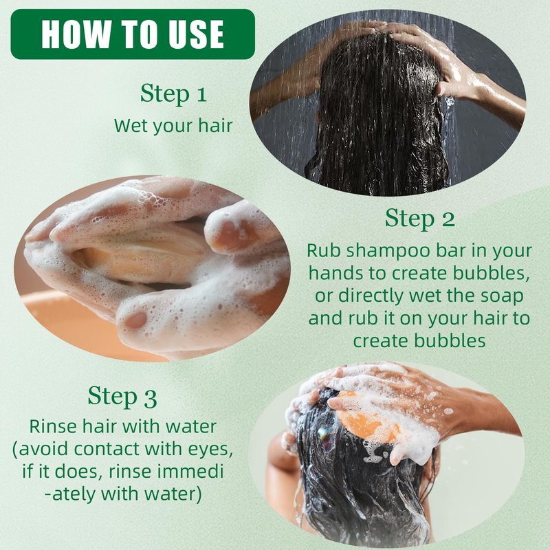Wet your hair, rub the shampoo bar with your hands, or directly rub the shampoo soap on your scalp. Massage onto the scalp and hair, then rinse thoroughly with warm water.
