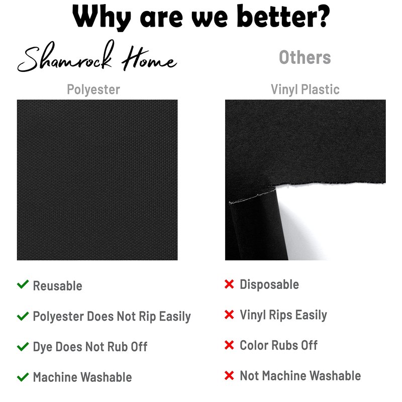 - A More Classy Kind Of Water Resistance: If you’re trying to avoid the ‘grubby’ feeling that comes with vinyl coverings, you’ll enjoy our 100% Polyester Tablecloth. Liquids bead on top, giving you time to wipe spills away, but without that greasy plastic/vinyl feel.