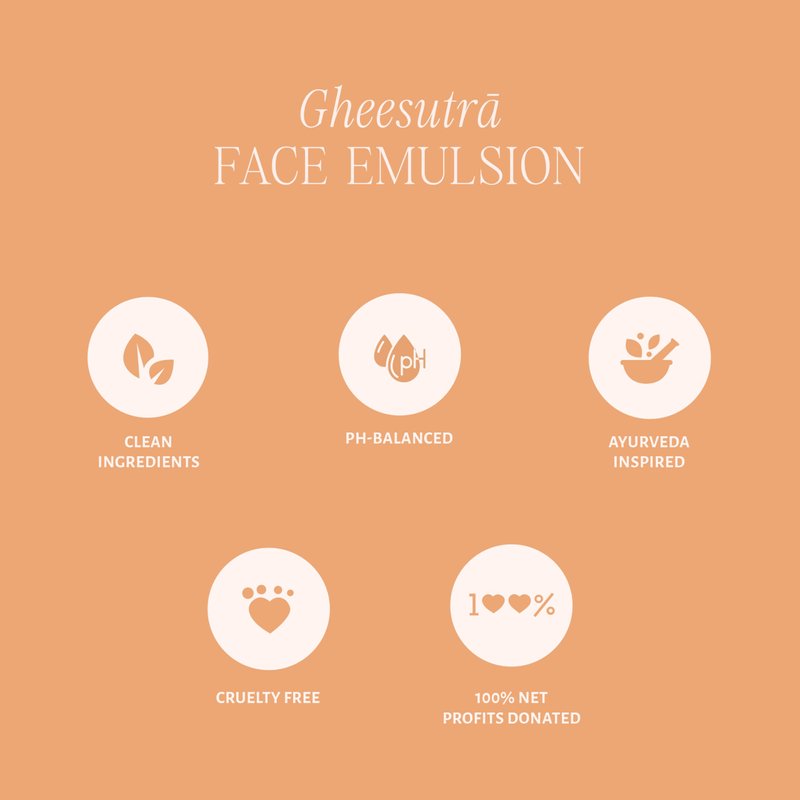 Does your skin feel dry and dull? Bring back its natural glow and healthy feel with Shankara Gheesutra Face Emulsion! This facial moisturizer provides a burst of nourishment that’ll help make your skin feel satiny soft and supple.This face moisturizer for dry skin is formulated with the time-tested Ayurvedic process that’s been around for generations. It seamlessly blends the wisdom of ancient traditions with modern skincare to ensure your skin gets the purest, most revitalizing care possible.Enriched with the goodness of 100X Washed A2 Ghee, Vitamin C, and Hibiscus, this face cream for women has rejuvenating properties that work to nourish the skin at a deeper level. It leaves you with a hydrated, clearer, and even-toned complexion.How to use the Shankara Face Emulsion:1. Cleanse your face and neck with your favorite cleanser (such as Shankara's Hydrating Cleanser or Purifying Cleanser).2. Follow with a serum of your choice (such as Shankara’s Daily Repair or Ageless Serum).3. Apply a generous amount of Gheesutrā Face Emulsion to your face and neck. Gently massage until the emulsion is fully absorbed into the skin.For optimal results, make this ritual a part of both your morning and nighttime skincare routine. Elevate your skincare experience with Shankara Gheesutra Face Emulsion!