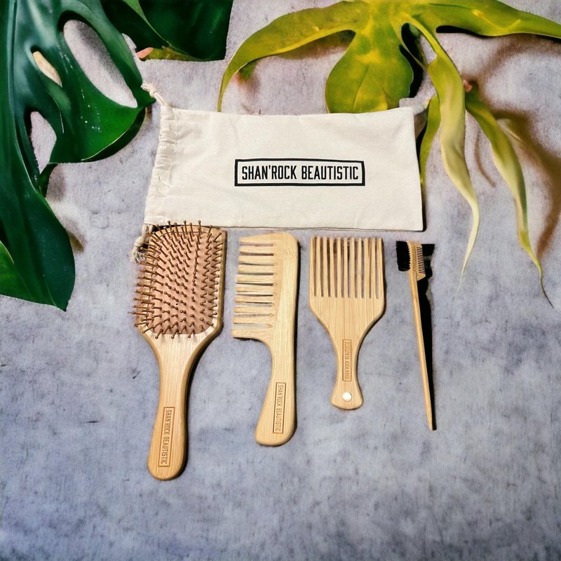 SHAN'ROCK BEAUTISTIC 4pc Eco-Friendly Bamboo Wide-Tooth Comb,Paddle Detangling Brush, Pick and Edge Brush Set for Thick, Curly, Straight, Wavy, Dry and Fine Hair