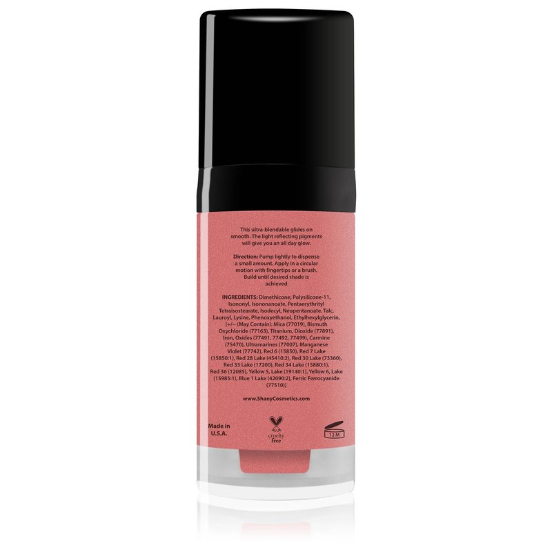 - Smooth Finish: A little goes a long way with SHANY nourishing Paraben Free Liquid Blush. This long-lasting Cream to powder blush goes on easy ,will not crack or flake. Its satin texture glides and blends easily on your skin.