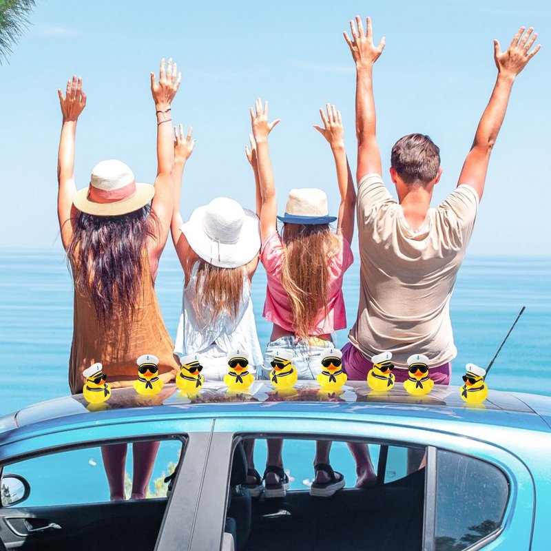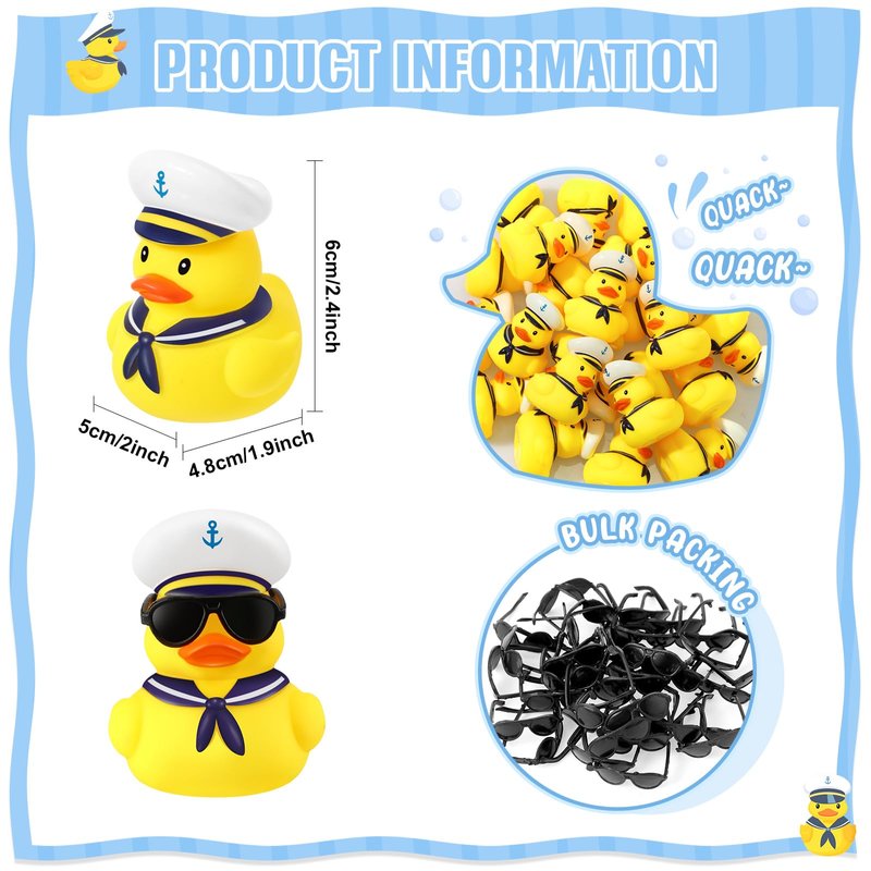 - What's in the Package: you will receive 24 cruise ship ducks, paired with 24 black mini sunglasses, and the ducklings have sound devices installed on the bottom, which can be pressed and squeezed to make a sound, enough to share with family or mates