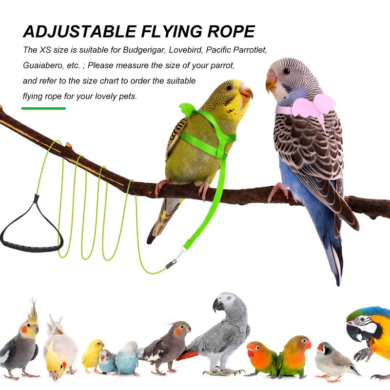 - Adjustable flying rope: the green and pink flying rope is adjustable and please adjust the length of the flying leash to make it more comfortable for your birds. The XS size is suitable for Budgerigar, Lovebird, Pacific Parrotlet, Guaiabero, etc. ; Please measure the size of your parrot, and refer to the size chart to order the suitable flying rope for your lovely pets