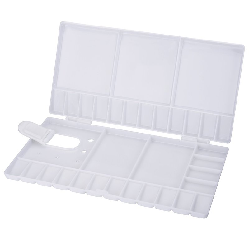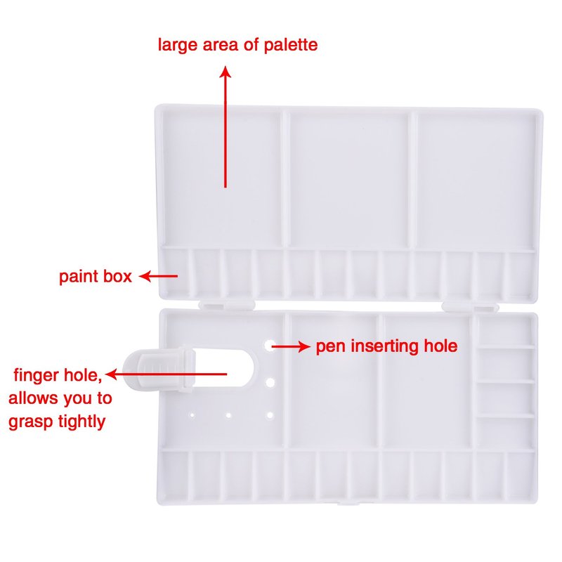 Shappy watercolor palette folding paint tray plastic painting pallet with 33 compartments, thumbhole and brush holders, whiteFeatures:With the thumbhole and 5 different sized brush holes, this palette is good for easy operation with one hand, and the lid will help to maintain the moisture of your paints. And there are many compartments for you to use, this palette has 28 small wells and 5 big wells, you can squeeze some paint in the small wells and mix them in the big wells, very convenient and practical for painters.Applicable users: Palette with lid is good for artists, students from art department, crafters, painters, painting lovers to use, good as school supply and personal painting tools. The plastic palette is sturdy and lightweight, the surfaces are smooth enough, easy to clean as well. You can take them for art outings.Specifications:Unfold size: 26 x 27 x 1.1 cm/ 10.24 x 10.62 x 0.41 inchesFold size: 26 x 13.5 x 2.1 cm/ 10.24 x 5.31 x 0.83 inchesMaterial: plasticColor: whiteQuantity: 1 piecePackage includes:1 x PaletteNote:The lid is not easy to be closed.Due to it is easy to be harmed, please do not press it hard.