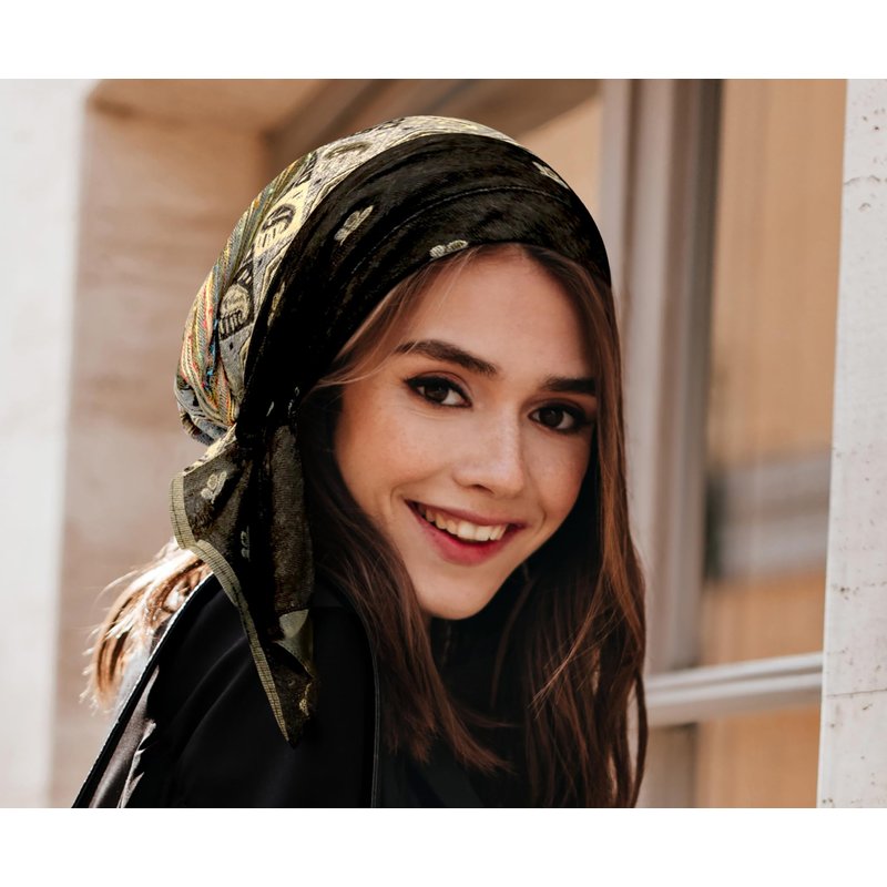 ShariRose Black Headscarf for Women Cashmere Headscarves Pre tied Head cover Head wear Head wrap Tichel Soft Ethnic Print Collection (black beige short)