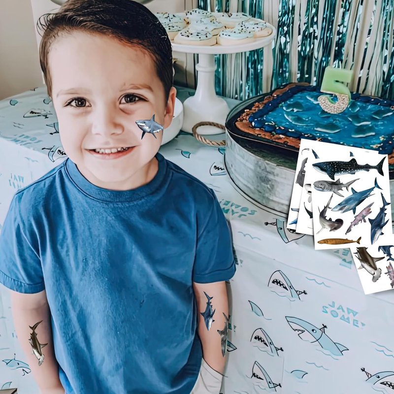 - Shark party decorations Package includes 108 pieces of Sea themed temporary tattoos, which can be used wherever you want, such as arms, face, and hands