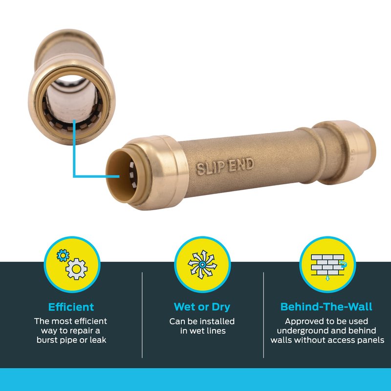 - SHARKBITE BRASS SLIP COUPLING: This push-to-connect full flow fitting allows you to repair a burst or a leak easily and efficiently; does the job of two couplings and extra pipe; remove using a disconnect clip or disconnect tongs