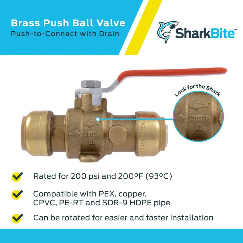 - EASY TO INSTALL: This intuitive SharkBite brass push ball valve allows for quick and easy installation, with no tools, crimping, glue, or soldering required; can be installed in wet lines; remove using a disconnect clip or disconnect tongs