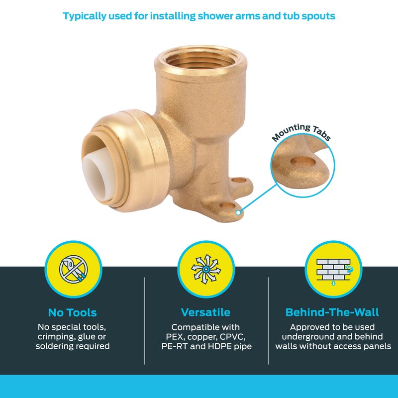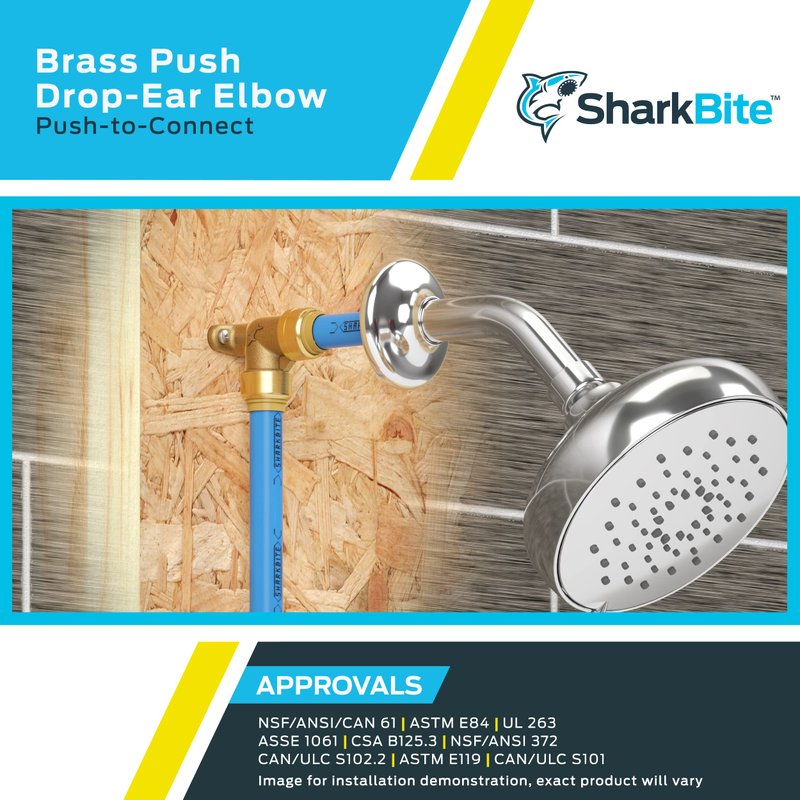 - EASY TO INSTALL: The SharkBite brass drop-ear elbow features a push-to-connect mechanism for a watertight union, and allows for quick and easy installation, with no tools, crimping, glue, or soldering required; usually used for installing shower arms and tub spouts