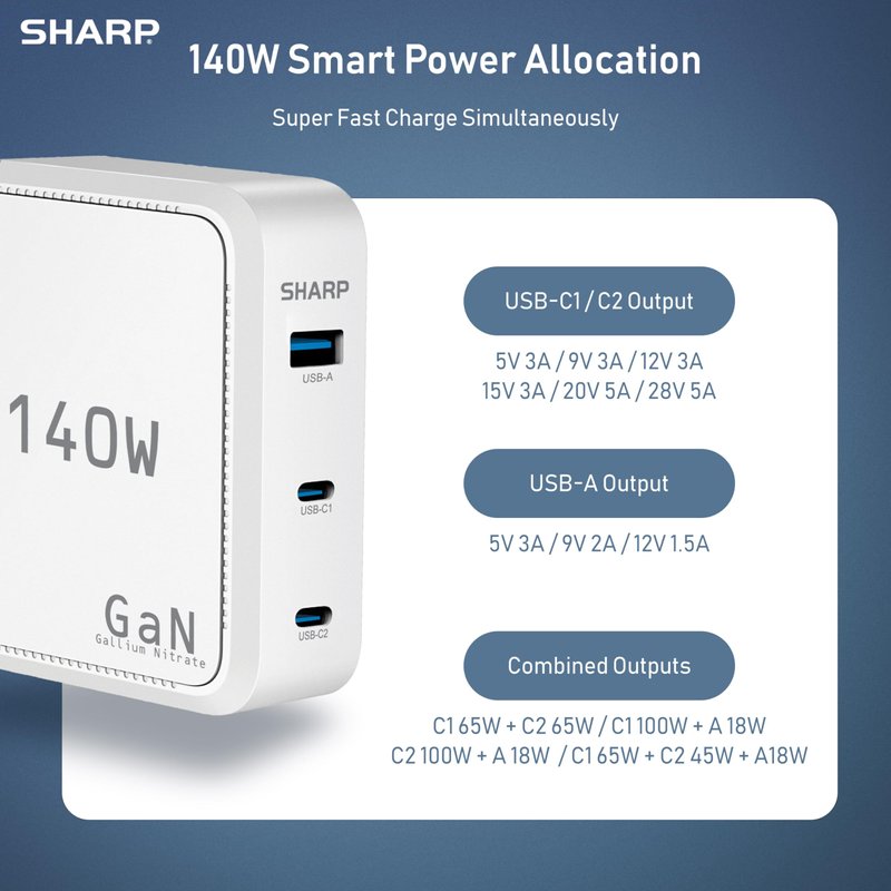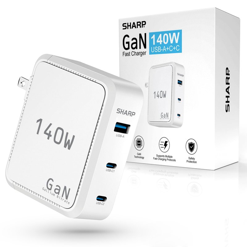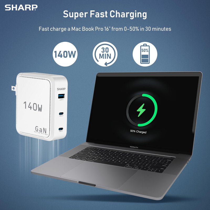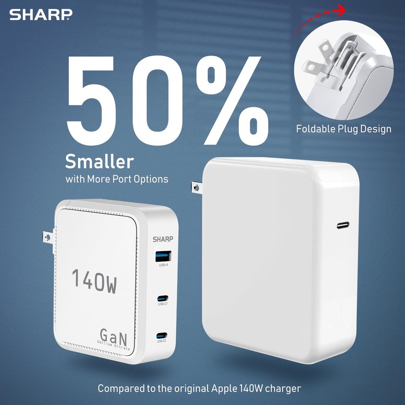 - Small and Compact: GaN Technology allows us to make the Sharp 140W charger smaller than traditional 140W chargers. Take it with you wherever you go and always have access to charge when you need it! Designed with foldable plugs for a compact design for easy portability.