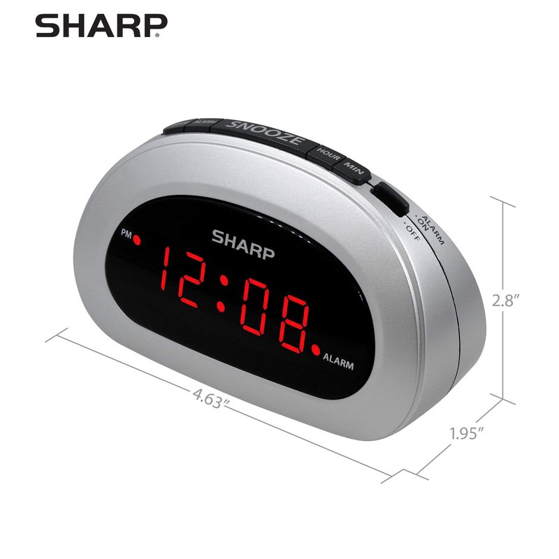 SHARP Small Digital Alarm Clock with Snooze and Battery Backup, Easy to Use Top Button Controls for Simple Use, Silver Case with Red Easy to Read LED Display