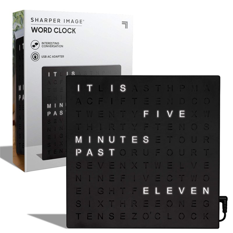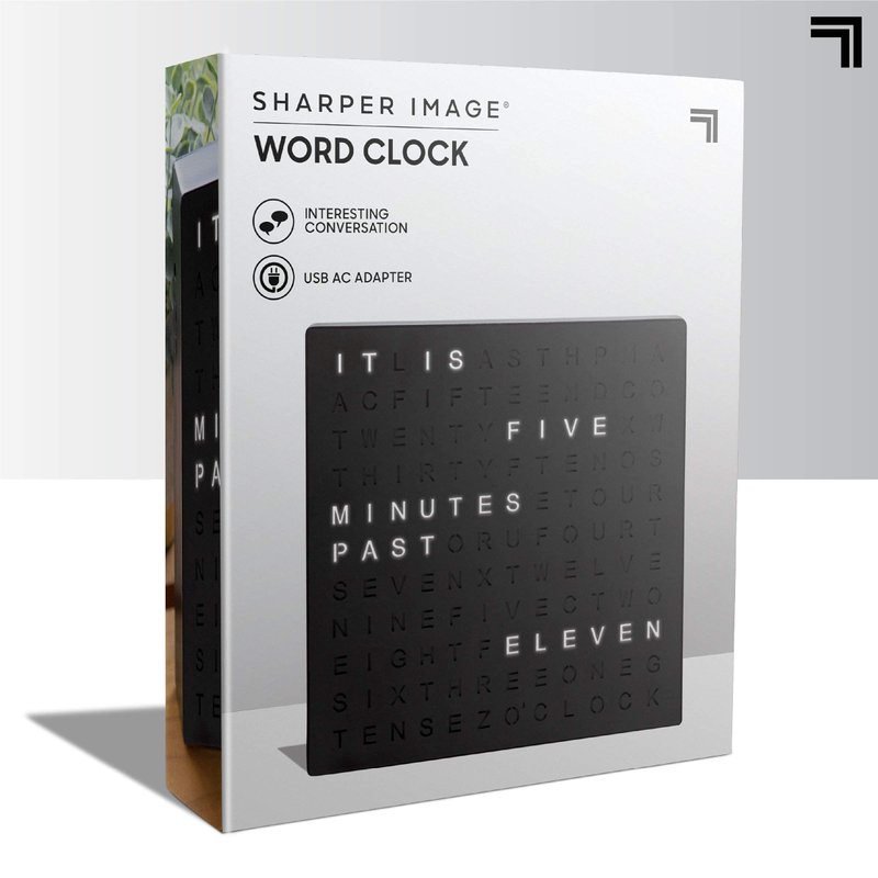 Sharper Image® LED Light-Up Word Clock, 7.75" Modern Design, Electronic Accent Wall or Desk Clock, USB Cord & Power Adapter, Unique Contemporary Home & Office Decor, Easy Setup, Housewarming Gift